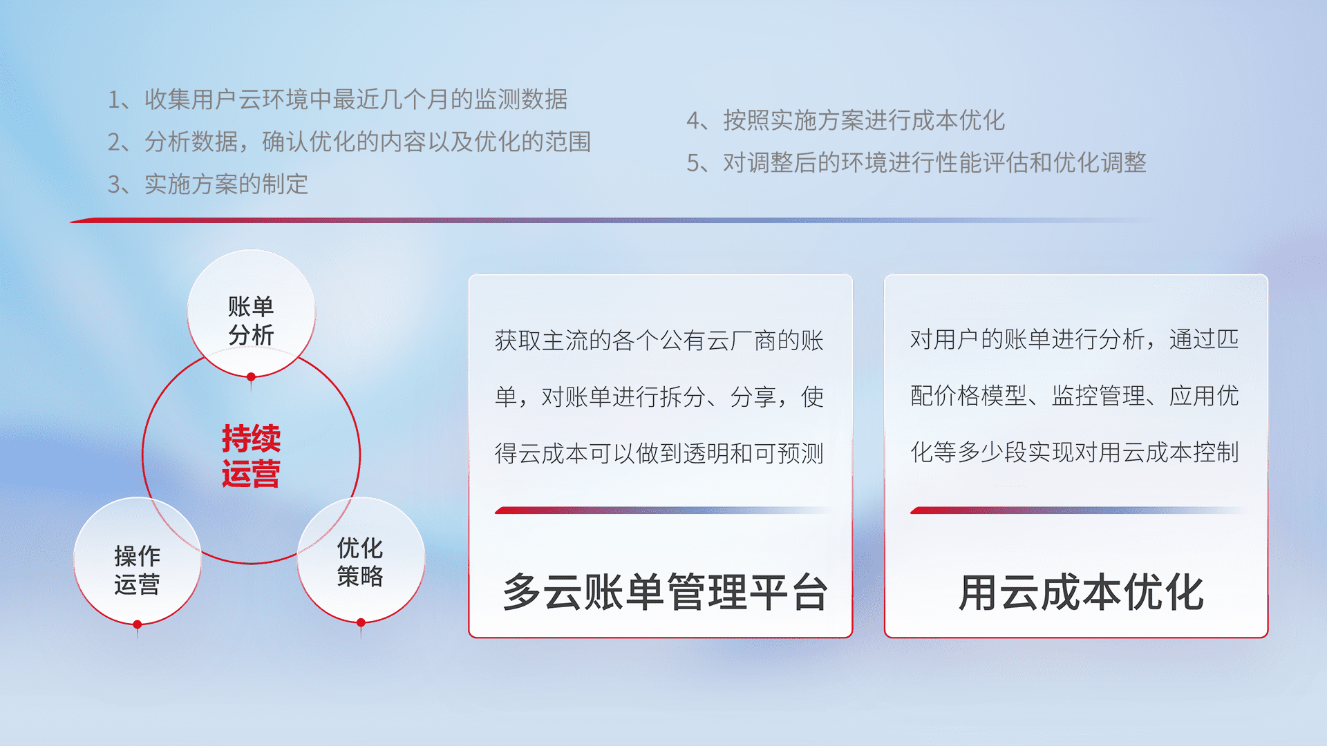 通过多云纳管,,,,以统一的资源数据模型把客户的云资源进行抽象和封装,,,,进而实现对多云资源的统一操作,,,,保障云资源管理的可靠性、、、稳定性与可用性。。。。量身定制化运维内容,,,配置、、、、开发运维、、、补丁管理、、备份、、、监控、、、、认证和访问管理、、、、审计和日常巡检等,,,,保障在用云过程中的可靠度,,,稳定度以及高可用率。。。。